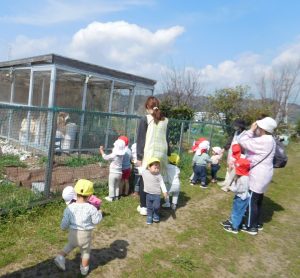 心地よい春の日差しは、心までポカポカ温かくなります!もうすぐ卒園するりす組さんもいっしょに、0歳児クラス、1歳児クラスのお友達と、近くのにわとり小屋までお散歩に行きました。2歳児クラスが、1歳児クラスのお友達と一緒に手を繋いで、優しくお話しながら歩いてくれました。そんな姿を見て、素敵なお兄さんお姉さんになったな・・と感じました 😀